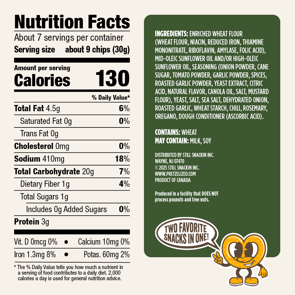 Ingredients: Enriched Wheat Flour (Wheat Flour, Niacin, Reduced Iron, Thiamine Mononitrate, Riboflavin, Amylase, Folic Acid), Mid-Oleic Sunflower Oil And/Or High-Oleic Sunflower Oil, Seasoning (Onion Powder, Spices, Roasted Garlic Powder, Yeast Extract, Citric Acid, Natural Flavor, Canola Oil, Salt, Mustard Flour), Yeast, Sea Salt, Dehydrated Onion, Roasted Garlic, Wheat Starch, Chili, Rosemary, Oregano, Dough Conditioner (Ascorbic Acid).